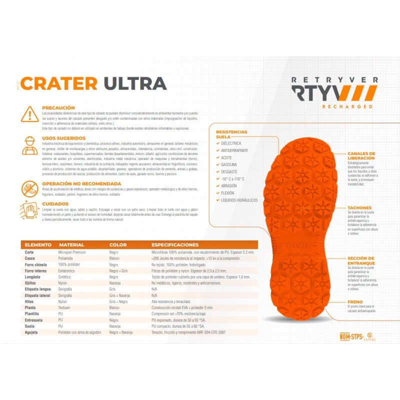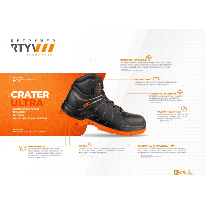 Presentamos el calzado industrial Crater Ultra de la marca Retryver, diseñado para brindar seguridad y confort en entornos de trabajo exigentes. Este modelo sin género combina materiales duraderos y tecnología avanzada, asegurando un soporte óptimo durante largas jornadas laborales. Su diseño innovador ofrece una apariencia moderna que se adapta a diversas actividades y profesiones.