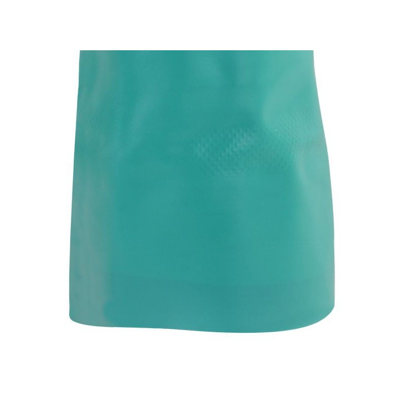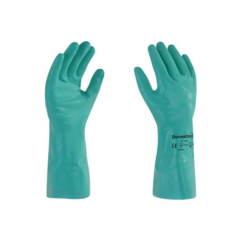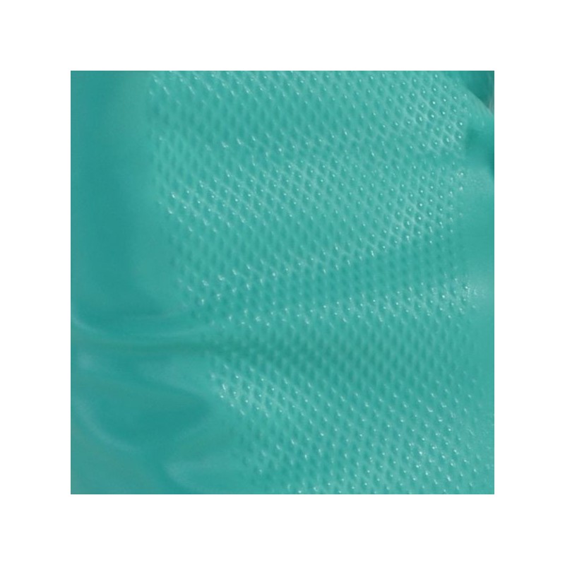 Guante de nitrilo verde de 13" de largo y 13 milésimas de espesor, con puño recto. El nitrilo en una de sus presentaciones mas usadas, ya que por las características de este modelo, con su grosor y diseño, permite alto rango de protección procesos mecánicos e industrias químicas, se recomienda para el manejo de solventes, aceites, pinturas y barnices, el relieve de la palma ofrece mayor adherencia en procesos resbaladizos o con presencia de líquidos. Aceptado por FDA para la manipulación de alimentos.